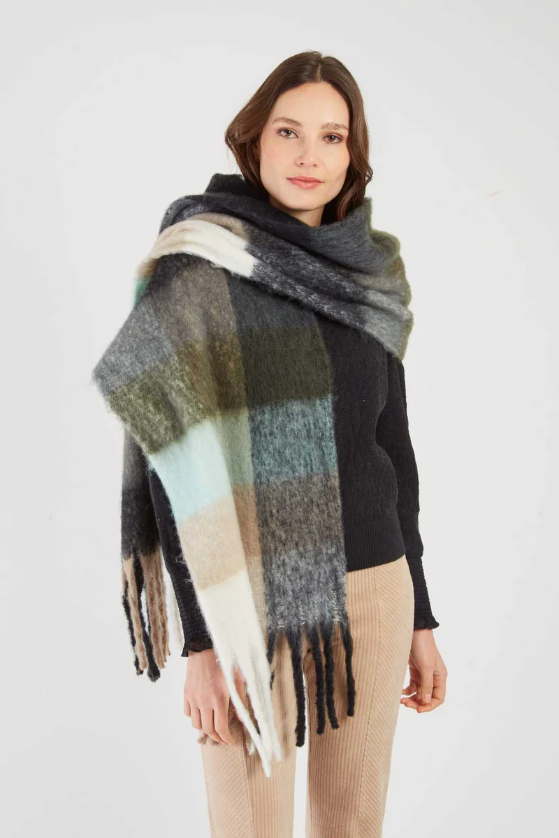 A long, soft knit scarf with fringed edges, featuring a gradient check pattern. The piece offers a generous, enveloping fit, ideal for casual wear around the neck or shoulders.